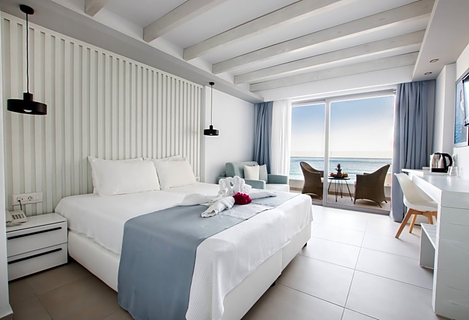 Junior Suite with Sea View is 323 square feet and includes either a king-size bed 150-183 width or a single bed 80-130 width plus balcony, extra beds on demand, desk, satellite tv , cable tv, hairdryer, safe, bathrobes, and slippers.